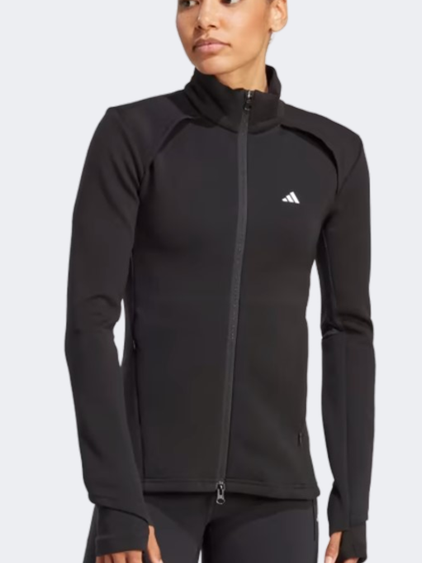Warm up, work out or cool down in this adidas jacket. With a lightweight build, it's a training staple that's made with how you move in mind. The slim fit is flattering, and a full zip on the front lets you layer how you like. A mesh-lined neck and ventilation at the back keep you cool and comfortable. The high collar comes in handy on cooler days, and a secret cutout on the cuff gives you easy access to your watch. Side zip pockets take care of your phone, keys and whatever else you need.