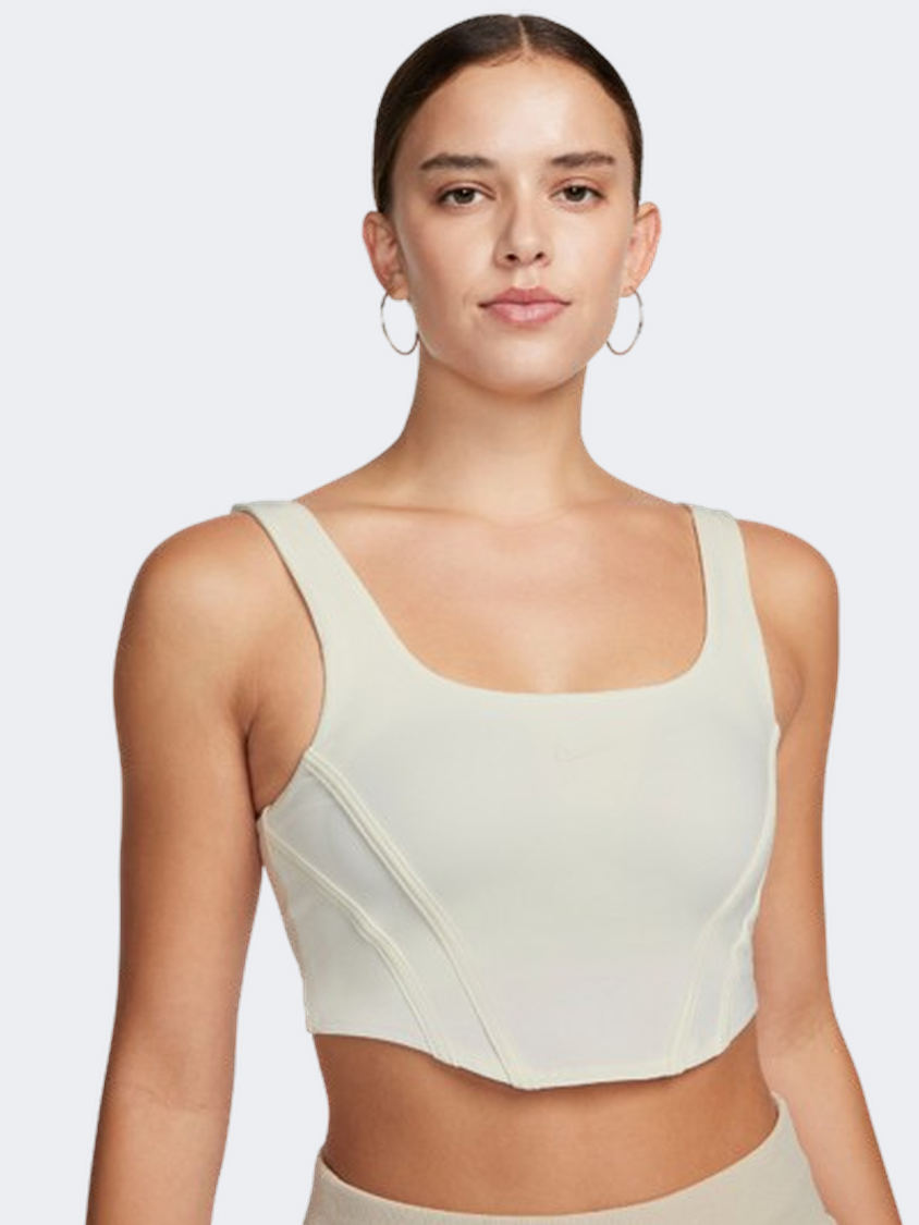 Fashion meets functionality and comfort for ultimate performance in this sweat-wicking corset-style bra. Decorative stitching mimics bones in the front, and a traditional extended hook closure continues the illusion in the back (but the bra is stretchy enough to change without opening). Removable pads let you customize your shape and coverage, while lightweight support gives you soft support with plenty of freedom. With the stretch and comfort of your favorite Nike sports bra and a flexible, lightweight outer layer, you get a runway look while feeling unrestricted.