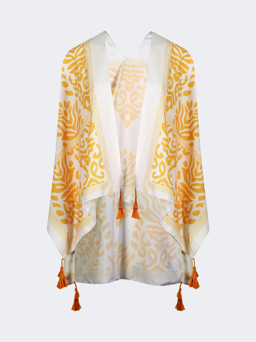 Short kimono in bright colors and decorative frills at the end. Ideal for all hours of the day.